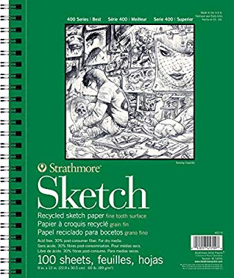 STRATHMORE-Recycled Spiral Sketch Book. A general purpose, medium weight sketch paper intended for experimentation or perfecting techniques. This package contains one 12×9 inch side spiral-bound sketch book with 100 sheets of 60lb acid free, lightly textured paper. Acid free and made of 30% post-consumer waste fiber. Made in USA.